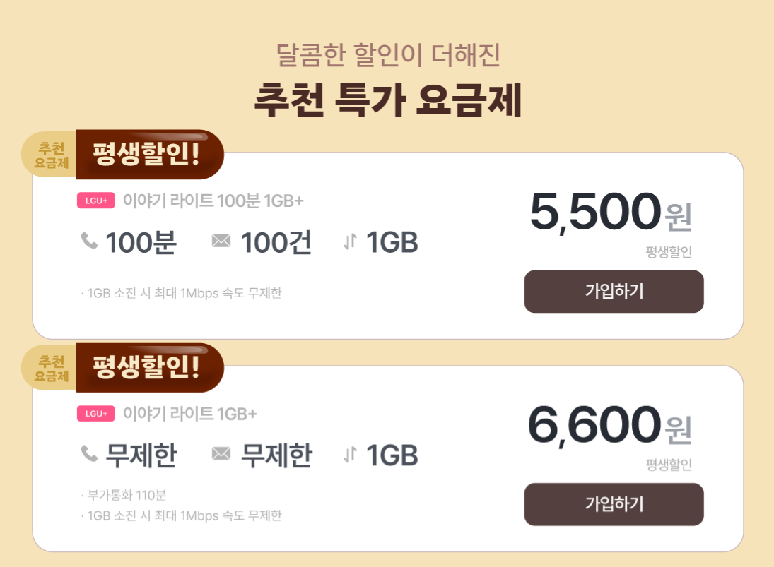데이터 1GB+무제한으로 사용할 수 있는 요금제 평생 월 5,500원이네요