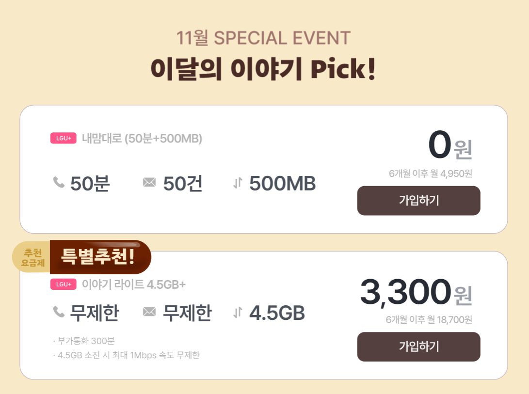 데이터 4.5GB+무제한인 요금제는 7개월동안 월 3,300원에 쓸 수 있네요